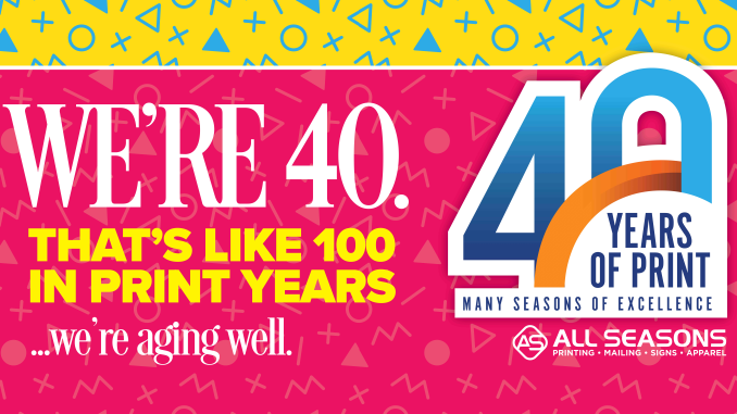 All Seasons Printing invites the community to join them for their 40th Birthday Celebration on Thursday, August 7! Come enjoy a day of fun, food, and nostalgia as they mark four amazing decades in business.