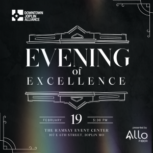 (Joplin, MO) – Downtown Joplin Alliance will hold their annual Evening of Excellence event on Thursday, February 19, at 5:30 pm. Presented by ALLO Fiber, the Evening of Excellence is a celebration of all who make the ongoing work of downtown revitalization possible — donors, volunteers, sponsors, businesses, and allies are welcome to the event.
