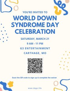 To celebrate, they’re hosting a World Down Syndrome Day Celebration with a designated play space at G3 Entertainment (2433 S. Garrison Avenue, Carthage, Missouri 64836) for families of individuals with Down syndrome. Participants are welcome to come and celebrate from 9:00 to 11:00 am as long as they meet the following requirements: