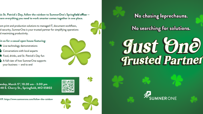 The open house will also feature food, drinks, and a relaxed St. Patrick’s Day atmosphere, creating a casual environment for local professionals to connect and learn. SumnerOne works with organizations across the region to support their workplace technology needs, from print environments and production equipment to IT infrastructure and document workflows. Events like this provide an opportunity for businesses to see how these solutions work together in real-world environments. Local business leaders, IT professionals, and operations teams are encouraged to attend and explore how the right technology—and the right partner—can help their organizations work smarter.